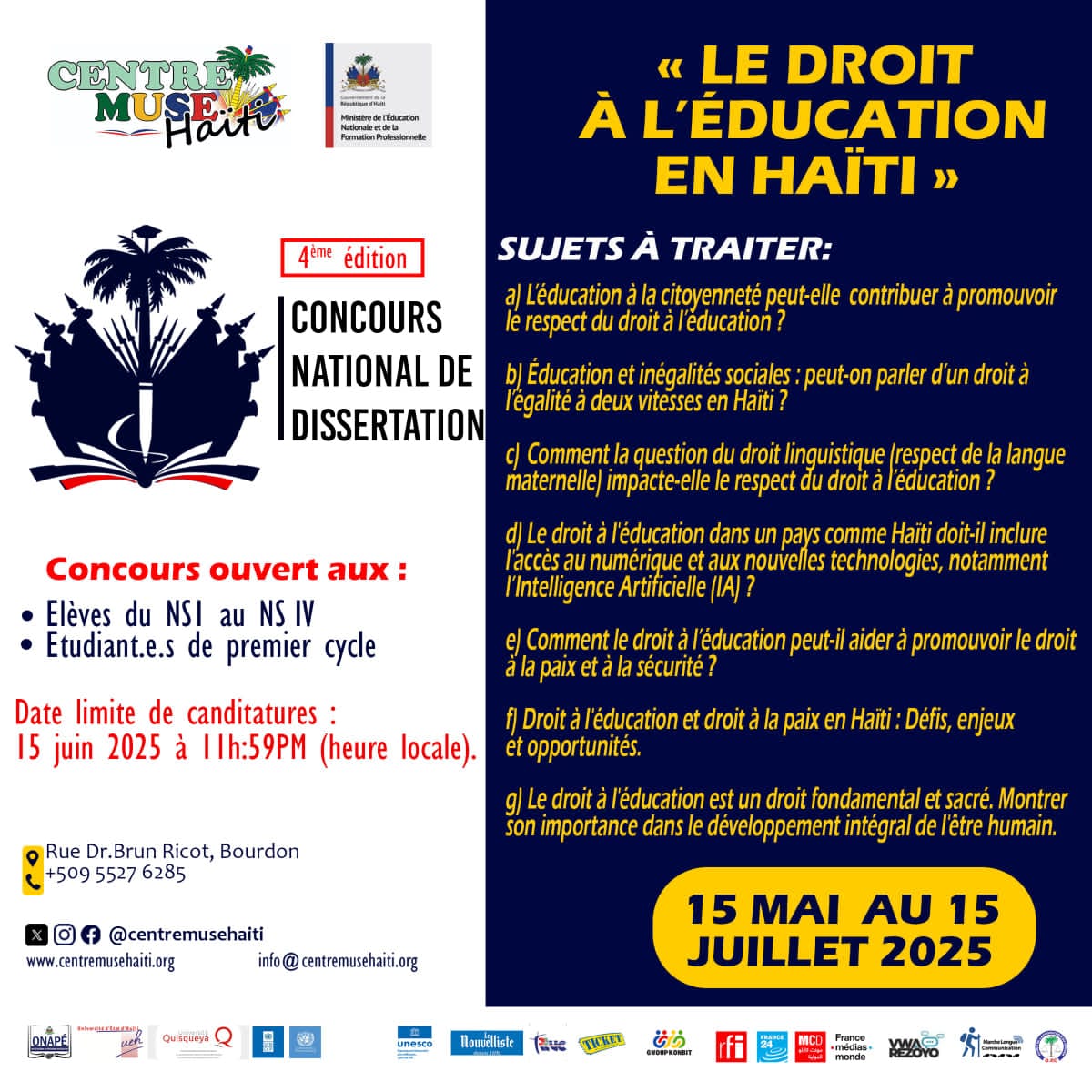 The Muse Haïti Center, in partnership with the Ministry of National Education and Vocational Training (MENFP), alongside several other national and international institutions, has officially launched the 4th edition of its National Essay Competition. This annual initiative, which aims to encourage young people to engage in critical and civic thinking, focuses this year on a highly topical theme: "The Right to Education in Haiti."